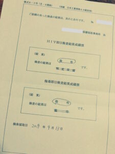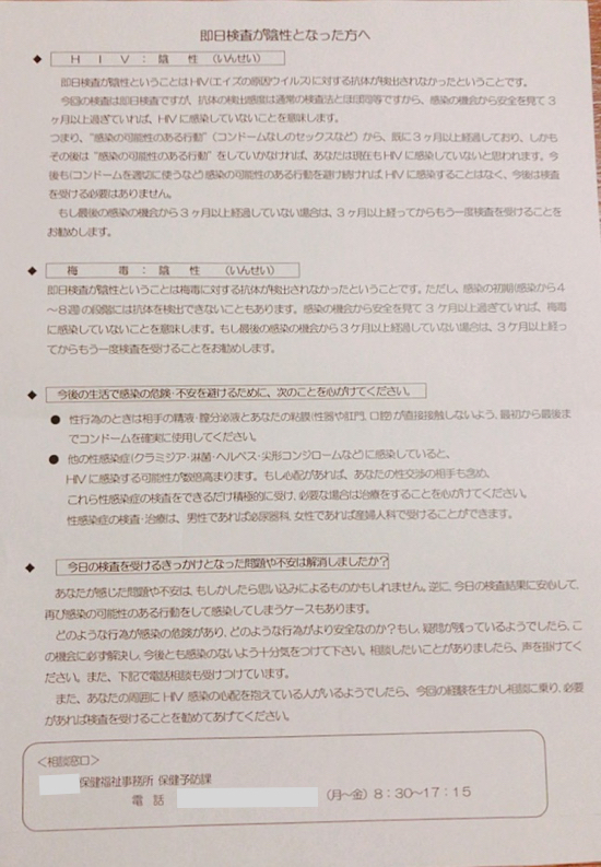 別室に行き、『HIV即日検査結果成績表』と書かれた結果用紙をもらい、説明を受けます。
